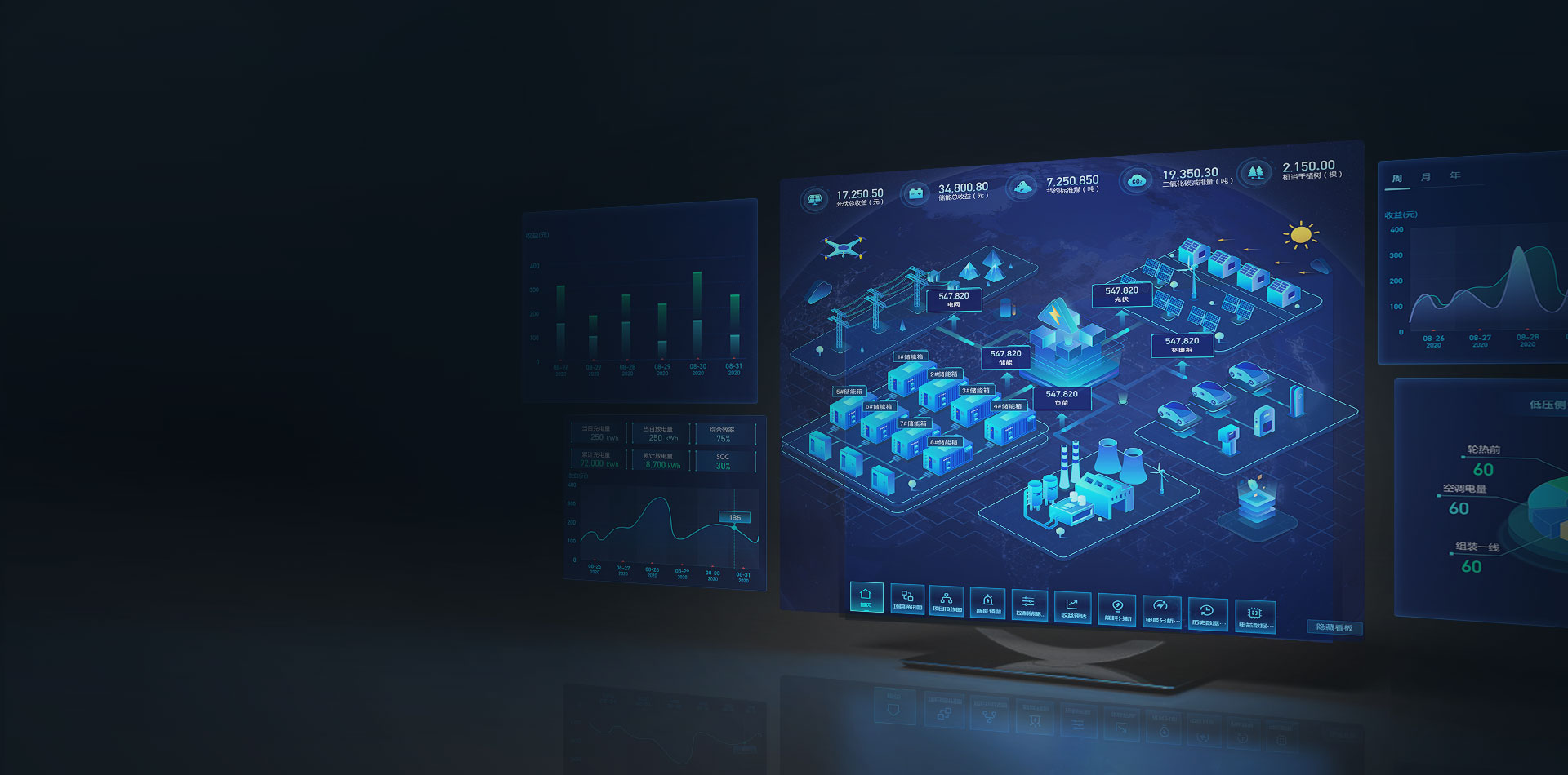 1.能量管理系统实时监测线路剩余容量及负荷大小,并与分布式光伏、充电设备等能量单位互动。